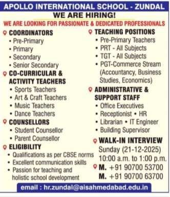 Apollo International School Zundal ખાતે આ ભરતી માટે Walk-In Interview નું આયોજન 21 ડિસેમ્બર 2025 (Sunday) ના રોજ કરવામાં આવ્યું છે. ઇન્ટરવ્યુનો સમય 10:00 a.m. થી 1:00 p.m. સુધી રહેશે. ઉમેદવારોને સમયસર હાજર રહેવાની સલાહ આપવામાં આવે છે.