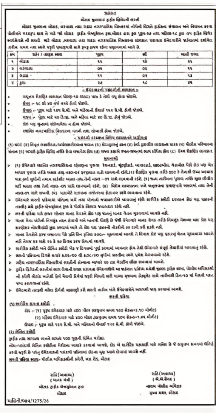 Botad Traffic Education Trust Recruitment: બોટાદ ટ્રાફિક એજ્યુકેશન ટ્રસ્ટ દ્વારા ધોરણ 10 પાસ પર ટ્રાફિક બ્રિગેડ સ્વયંસેવક ના પદો પર કોઈ પણ પ્રકાર ની અરજી ફી વગર ભરતી જાહેર