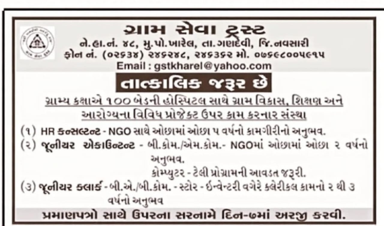 Gram Seva Trust Recruitment: ગ્રામ સેવા ટ્રસ્ટ, ખારેલ, તાલુકો ગણદેવી, જિલ્લો નવસારી દ્વારા તાત્કાલિક ધોરણે લાયક અને અનુભવ ધરાવતા ઉમેદવારો પાસેથી વિવિધ વહીવટી અને હિસાબી પદો માટે અરજીઓ મંગાવવામાં આવે છે. આ સંસ્થા ગ્રામ્ય કક્ષાએ 100 બેડની હોસ્પિટલ સાથે ગ્રામ વિકાસ, શિક્ષણ અને આરોગ્ય ક્ષેત્રના અનેક પ્રોજેક્ટ્સ પર કાર્યરત છે. સંસ્થાના દૈનિક કામગીરીને વધુ સુવ્યવસ્થિત બનાવવા માટે નીચે દર્શાવેલ પદો માટે ભરતી પ્રક્રિયા હાથ ધરવામાં આવી છે.અમે આ લેખમાં ઉમેદવાર ને પાત્રતા, પગાર, પસંદગી પ્રક્રિયા, અને અરજી ની પ્રકિયા વિશે સંપૂર્ણ વિગતવાર માહિતી આપીશુ.