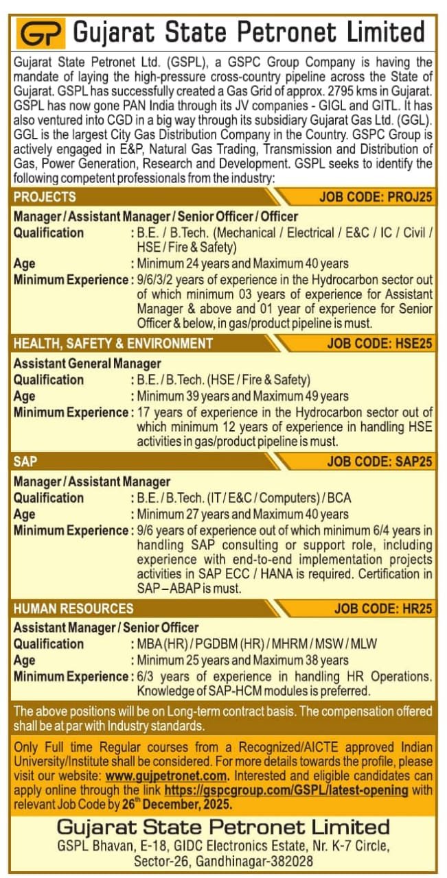 GSPL Recruitment 2025: ગુજરાત સ્ટેટ પેટ્રોનેટ લિમિટેડ દ્વારા અનુભવી અને પ્રોફેશનલ ઉમેદવારો માટે વિવિધ મહત્વપૂર્ણ પદો પર ભરતી જાહેર કરવામાં આવી છે. આ સંસ્થા ગુજરાત રાજ્યમાં હાઇ-પ્રેશર ગેસ પાઇપલાઇન નેટવર્ક વિકસાવવા માટે જાણીતી છે અને છેલ્લા કેટલાય વર્ષોથી ઊર્જા ક્ષેત્રમાં નોંધપાત્ર યોગદાન આપી રહી છે. હાલ સંસ્થા પ્રોજેક્ટ, હેલ્થ સેફ્ટી એન્ડ એન્વાયરમેન્ટ, SAP અને હ્યુમન રિસોર્સ જેવા વિભાગોમાં લાંબા ગાળાના કરાર આધારિત પદો માટે લાયક ઉમેદવારો પાસેથી અરજીઓ આમંત્રિત કરે છે.