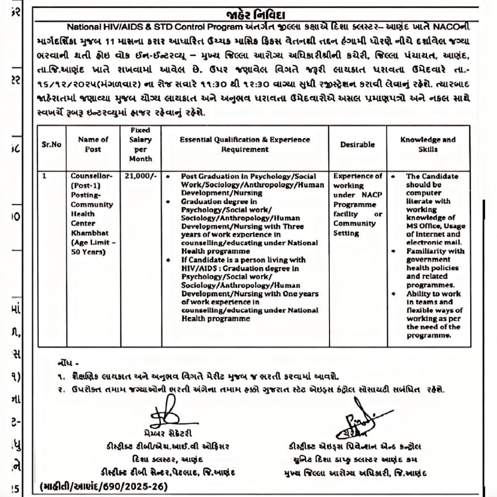 આ ભરતીમાં Counsellor પદ માટે એક જગ્યાની ભરતી કરવામાં આવી રહી છે. Counsellorની પોસ્ટ Community Health Center, Khambhat માટે છે અને પદ માટેની મહત્તમ વય મર્યાદા 50 વર્ષ રાખવામાં આવી છે.