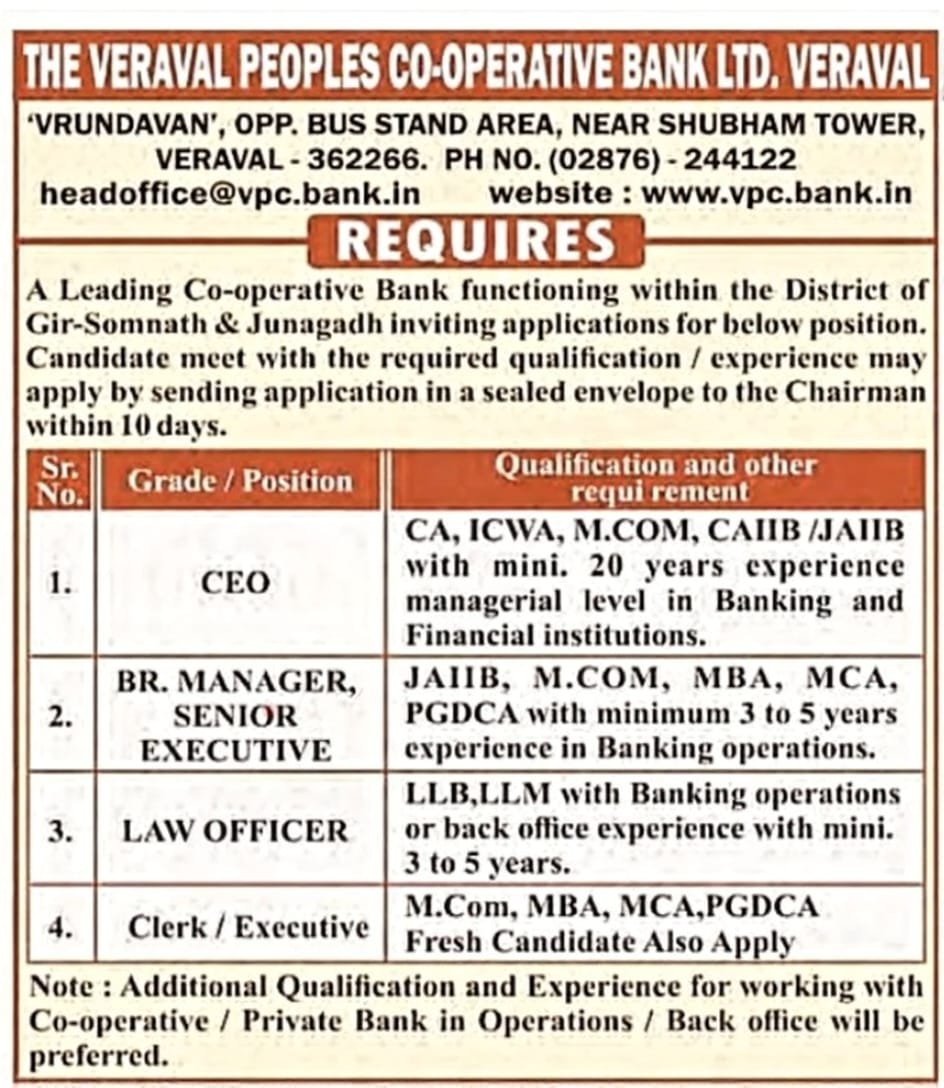The Veraval Peoples Co-Operative Bank Ltd Recruitment। વેરાવળ પીપલ્સ કો-ઓપરેટિવ બેંક લિ. ભરતી