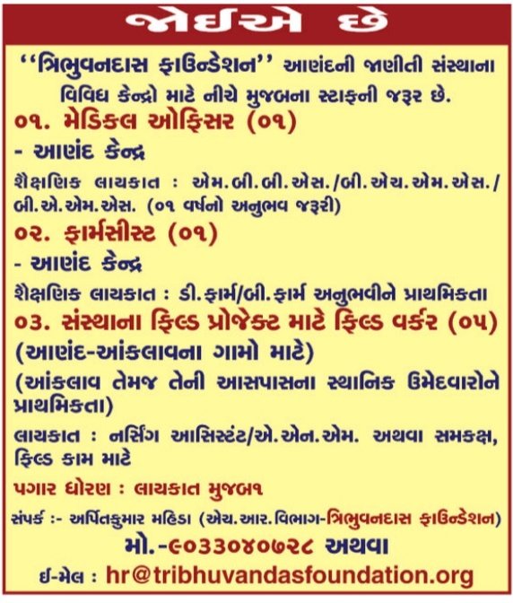 - અરજી Email દ્વારા hr@tribhuvandasfoundation.org પર મોકલવી